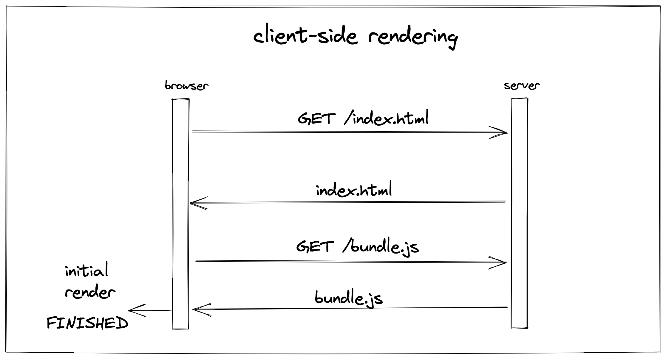 In client-side rendering, the browser makes a request for the index.html page, the server responds. the browser then reads this .html file and makes requests for any additional resources defined in it (CSS, JavaScript, favicon, images etc.). Only once the JavaScript is downloaded and can be executed, will there be anything rendered on the screen.