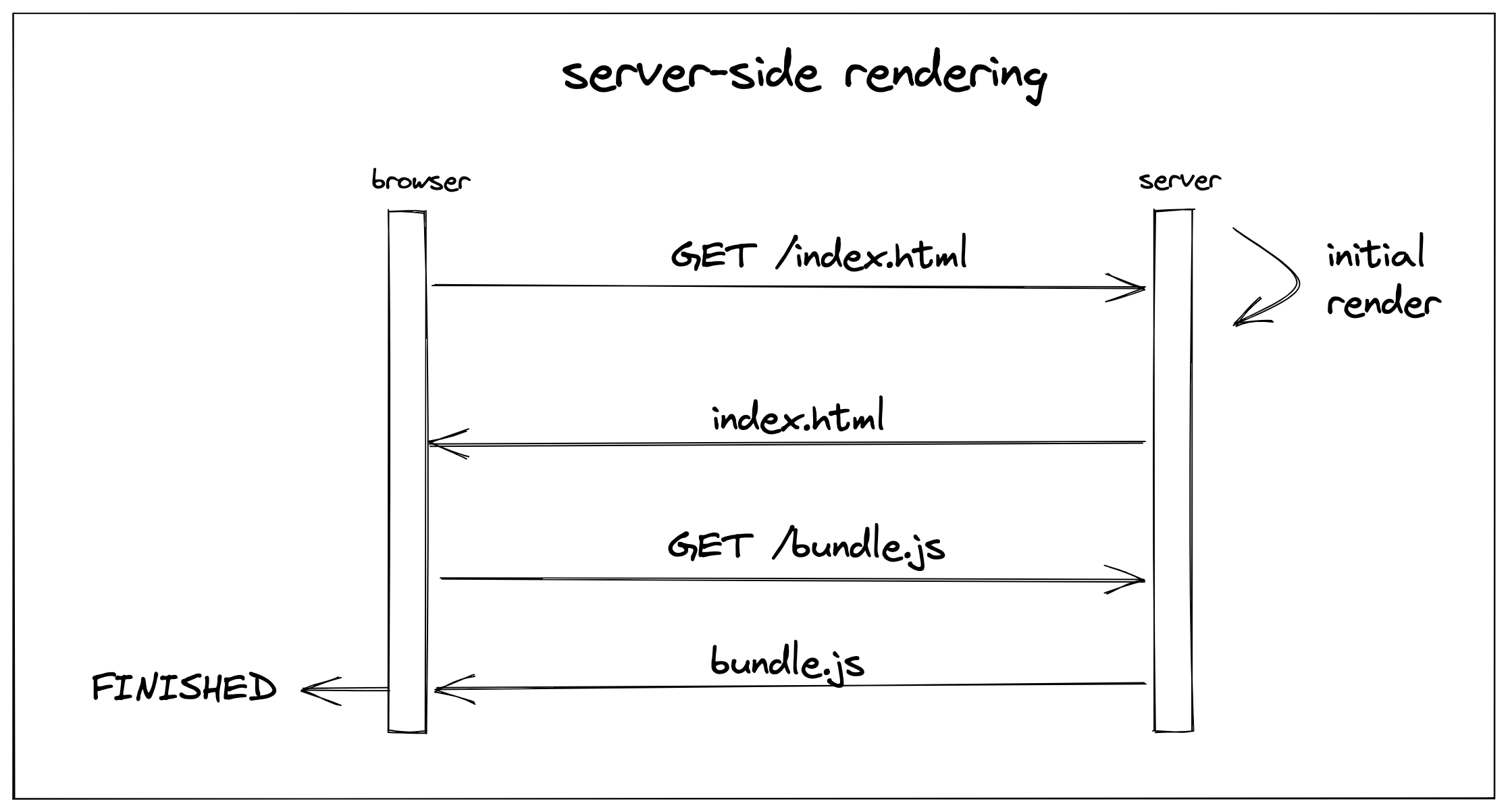 Server-side rendering means rendering the initial HTML on the server instead of waiting for the JavaScript to be loaded in the browser and then rendering.